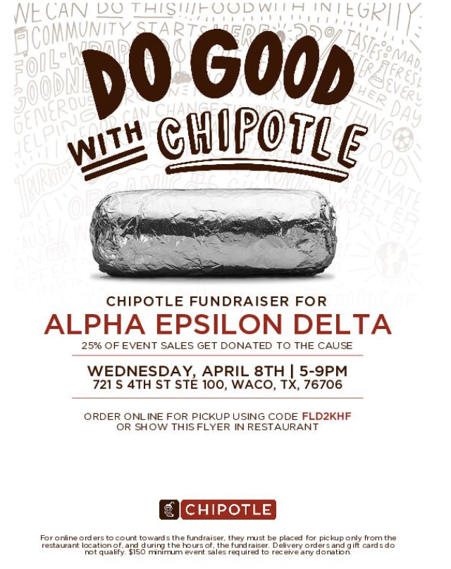 Join us at Chipotle anytime from 5pm - 9pm on Wednesday, 4/8 (Day of GM#5) to earn one social credit! Email a selfie or receipt to danny_le1@baylor.edu to receive credit